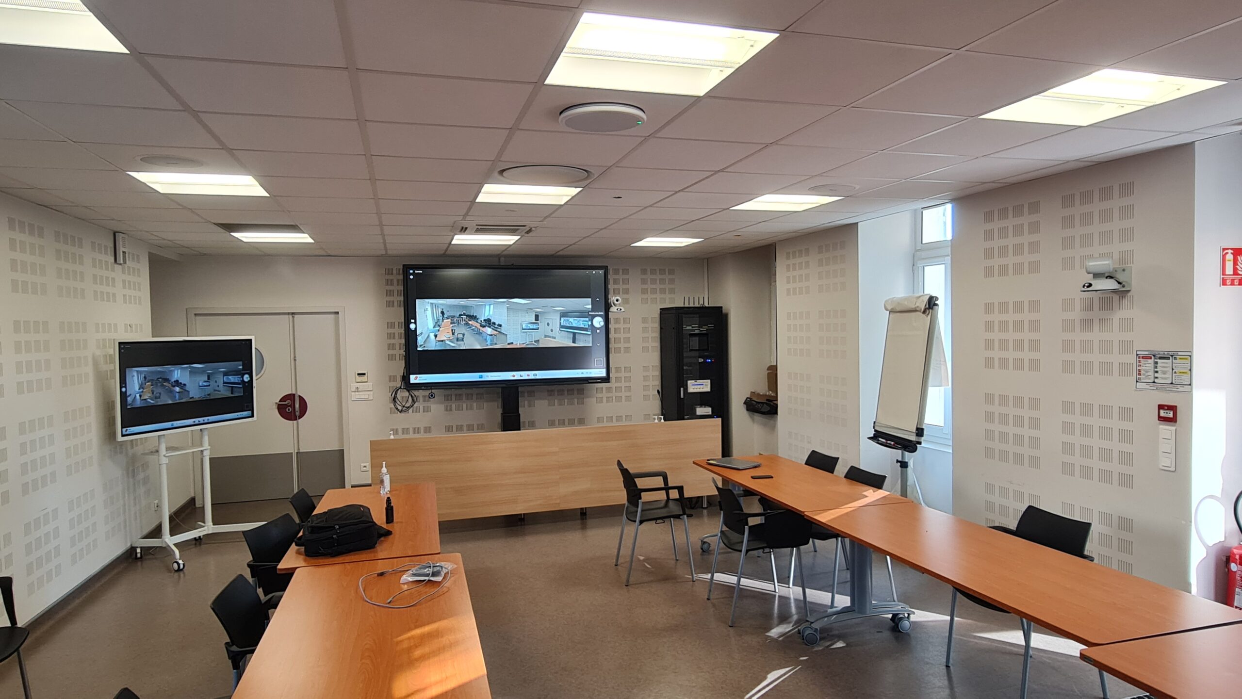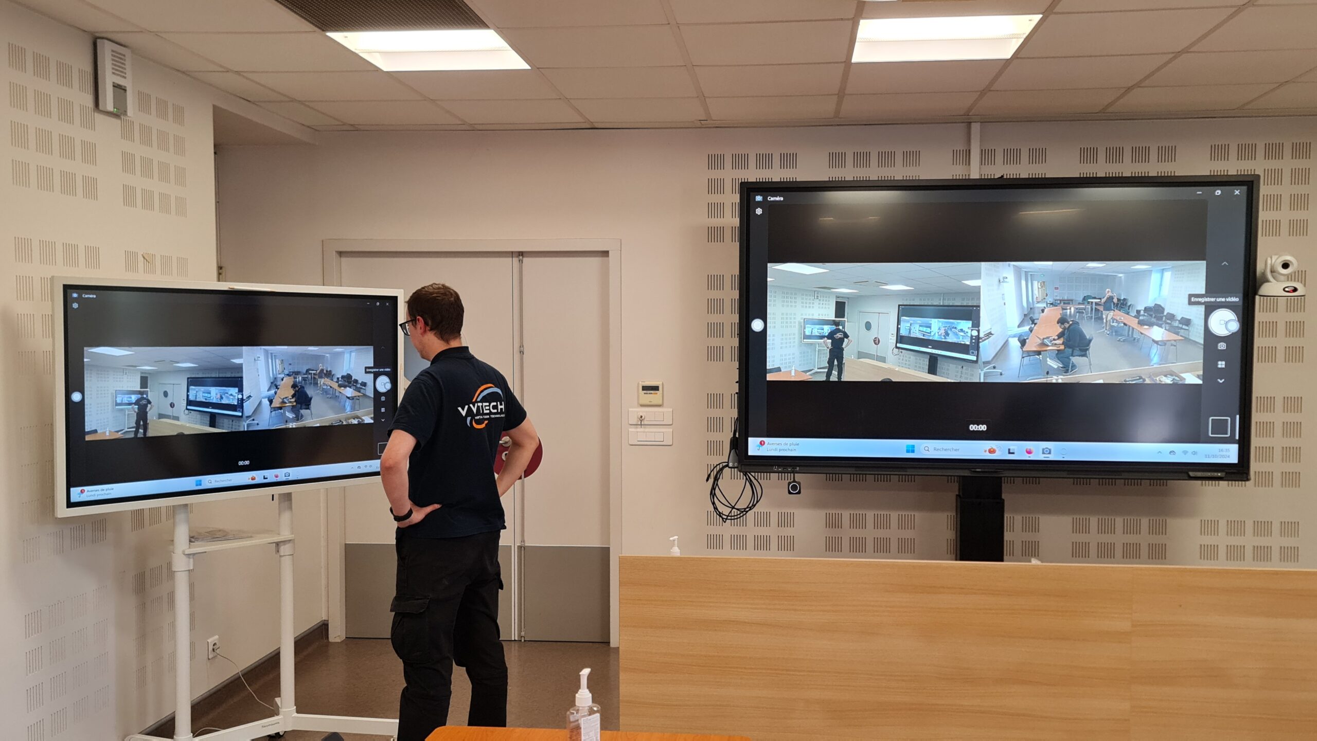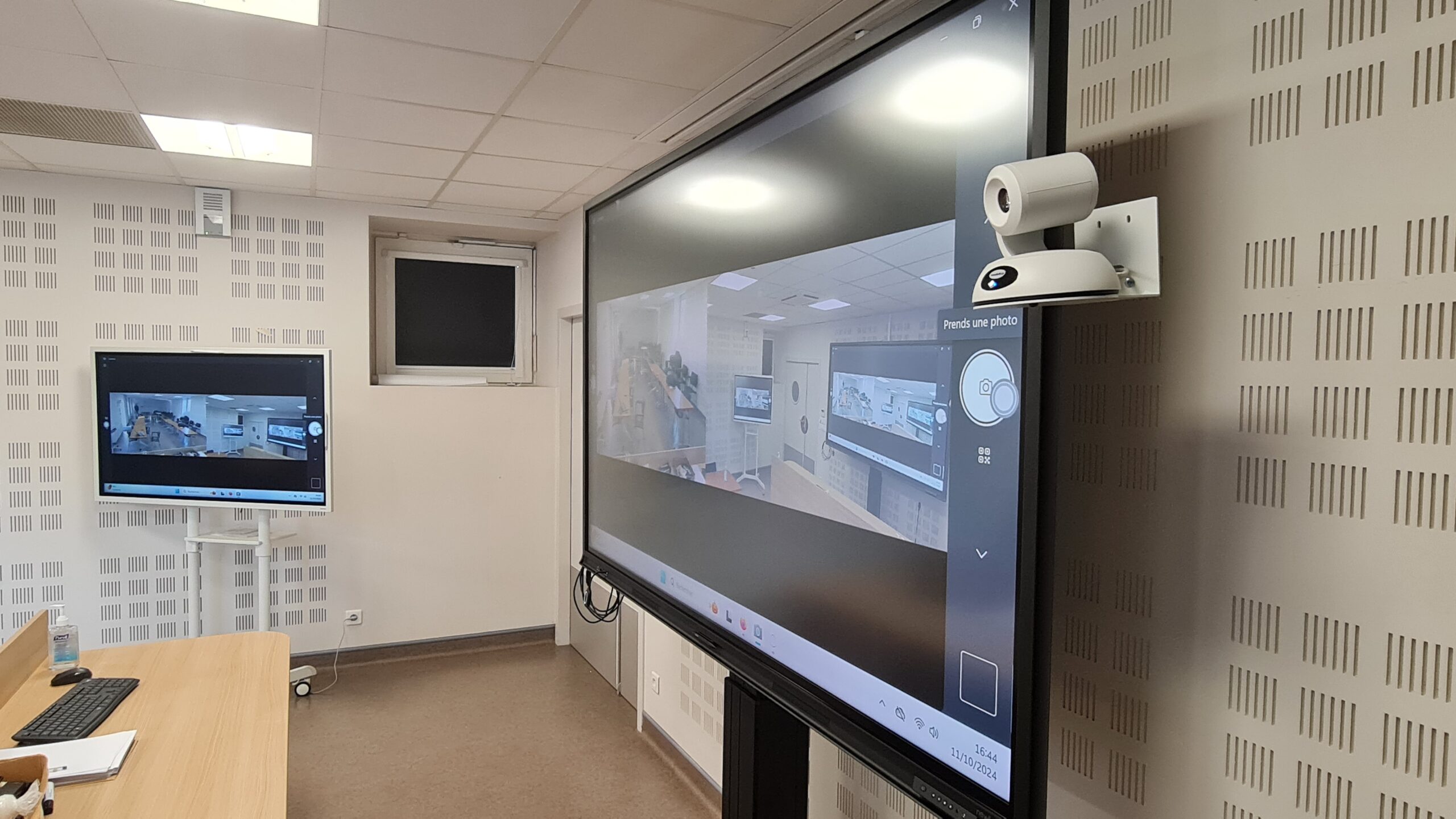 Mise en place d’un système complet de visioconférence avec un écran interactif principal de 98 pouces et un écran de déport pour une meilleure visibilité.
