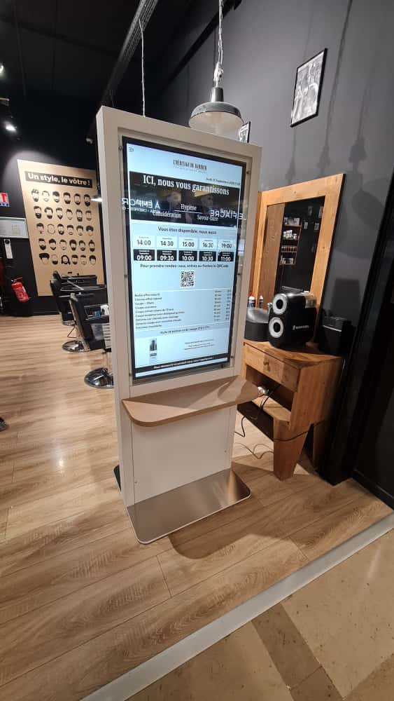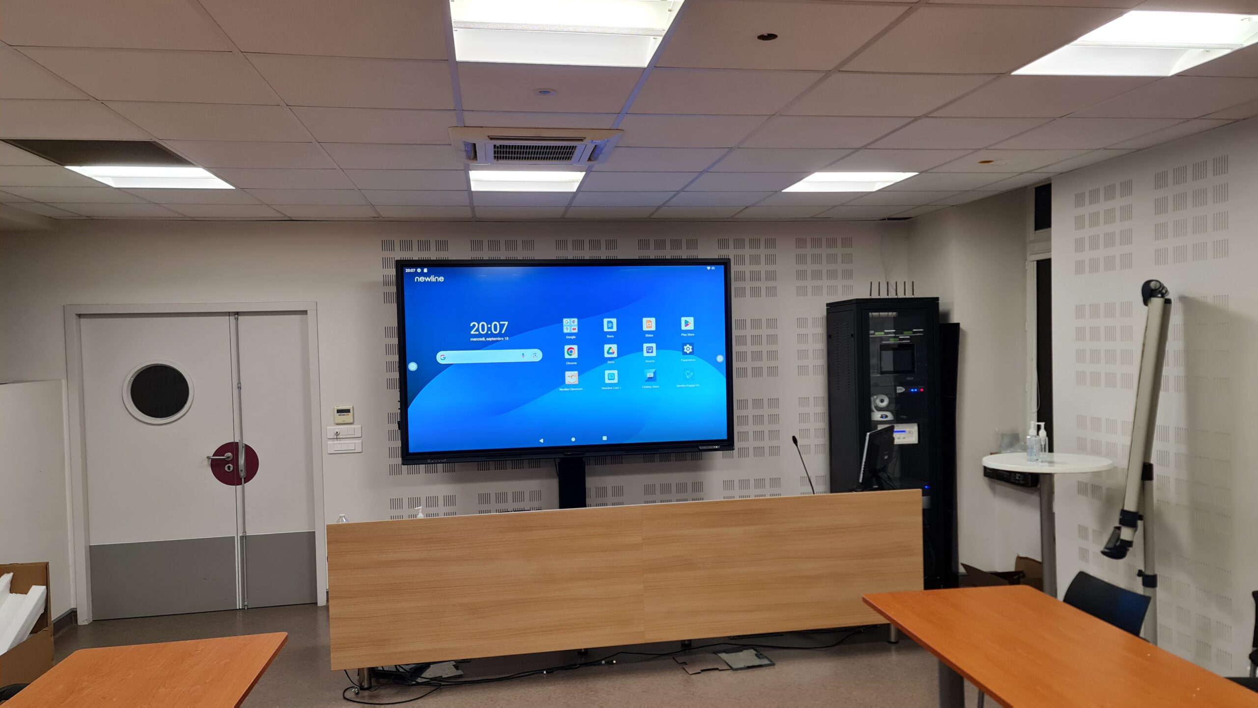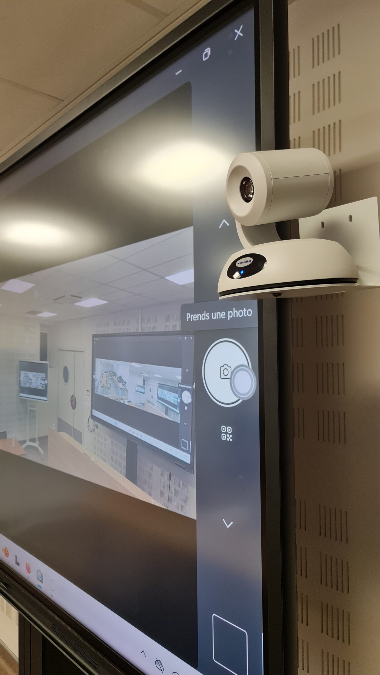 Mise en place d’un système complet de visioconférence avec un écran interactif principal de 98 pouces et un écran de déport pour une meilleure visibilité.