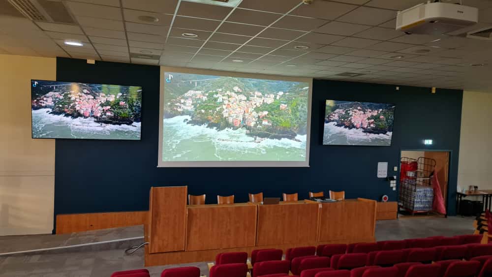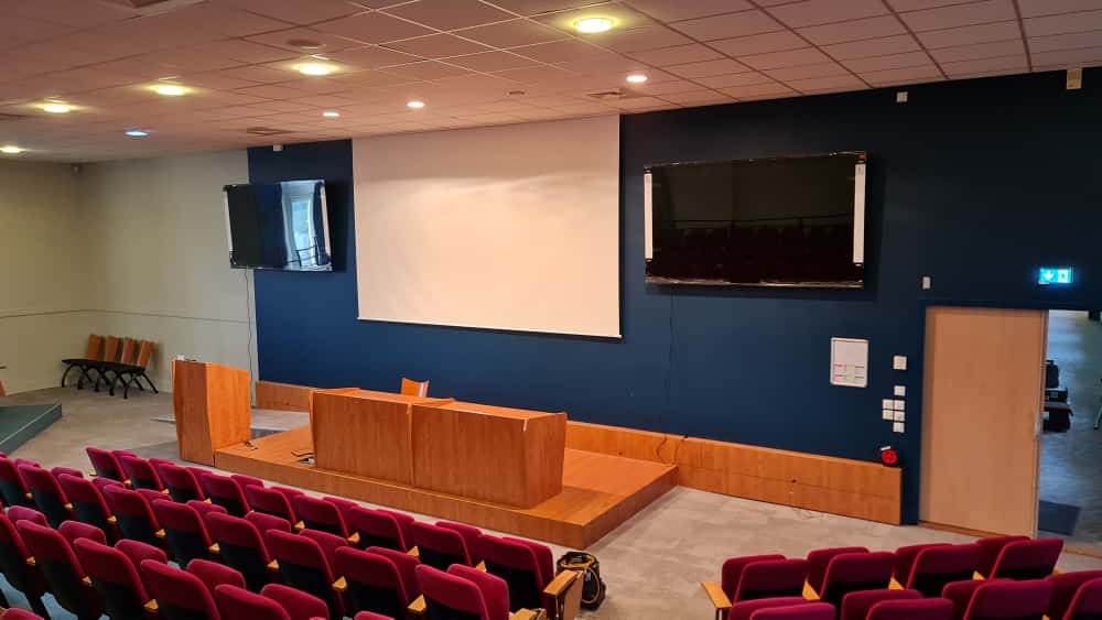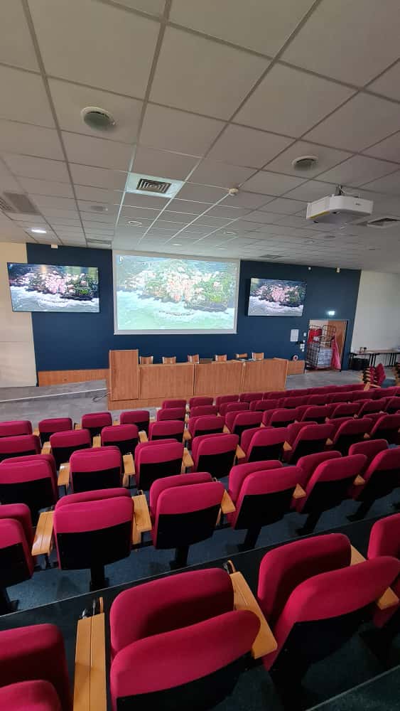 Reprise complète de l’amphithéâtre avec la mise en place d’écrans de déport 98 pouces et d’un vidéoprojecteur laser, modernisant l’ensemble de l’équipement existant.