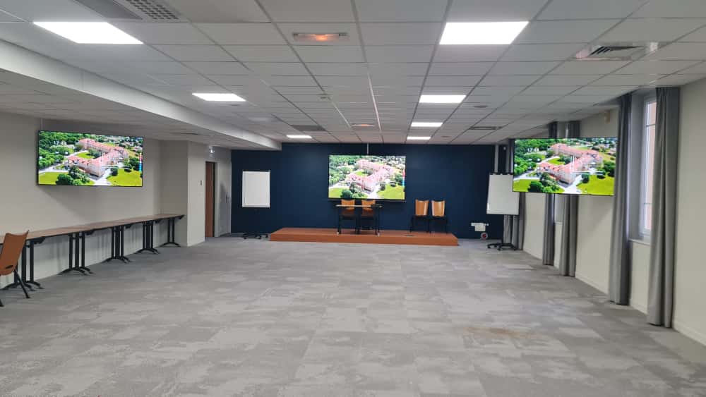 Renouvellement de plusieurs salles de séminaires avec l’installation d’écrans interactifs, complétés par des écrans de déport pour optimiser la visibilité.